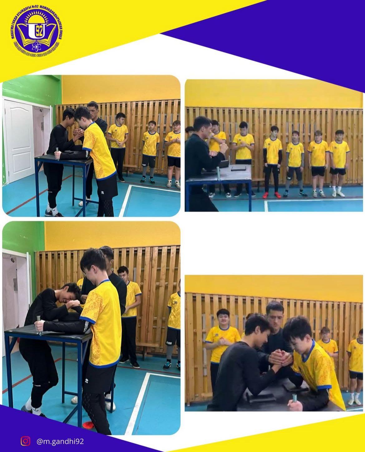 Ойынның шарты: Столдың шетіне қарама – қарсы екі ойыншы оң қолдарының шынтағын столға тіреп қояды да, бірінің қолын бірі алақандастыра мықтап ұстайды. Сол жақтағы қолдарын әркім өзінің оң жақ қолтығына тығып алады.Ұлттық ойынды дамыту мақсатында 8-сынып оқушыларына қол күрестен жарыс өтілді.