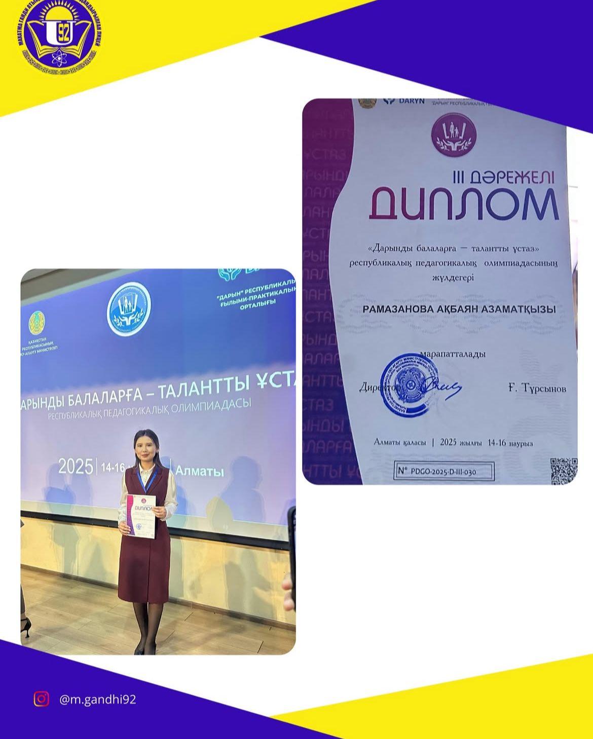 «Дарынды балаларға - талантты ұстаз» республикалық олимпиадасының республика кезеңінің 3-ші дәрежелі диплом иегері М. Ганди атындағы 92 мамандандырылған лицейдің физика пәні мұғалімі Рамазанова Ақбаян Азаматқызы марапатталды.