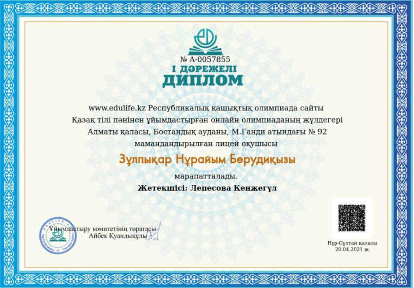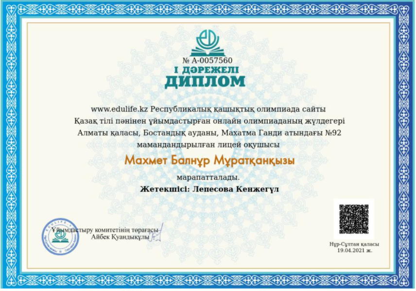 Қазақ тілі және қазақ әдебиеті пәнінен www.edulife.kz сайтында ұйымдастырылған Республикалық қашықтық олимпиадасына М.Ганди атындағы мамандандырылған №92 лицейден қатысқан: