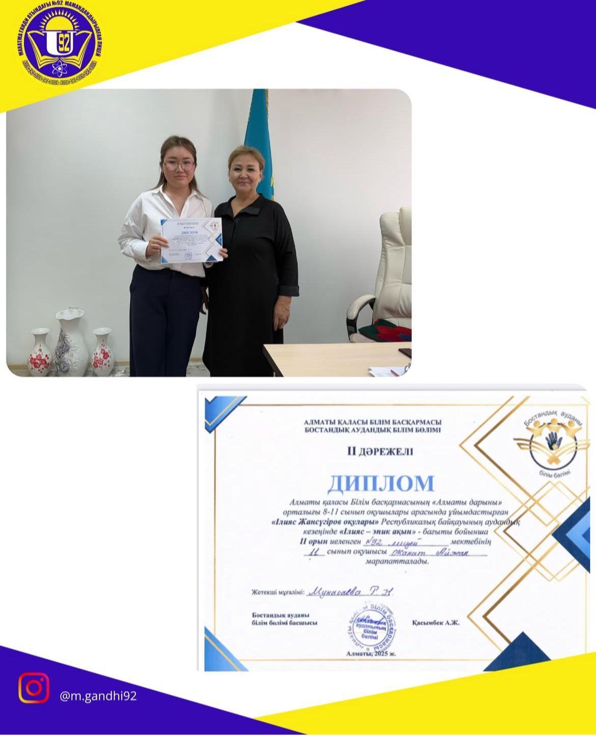Жалпы білім беру ұйымдарының 8-11 сынып оқушылары арасында өткен «Ілияс Жансүгіров оқулары» байқауының аудандық кезеңінің «Ілияс-эпик ақын»бағыты бойынша Жанат Айжан II дәрежелі дипломымен марапатталды.