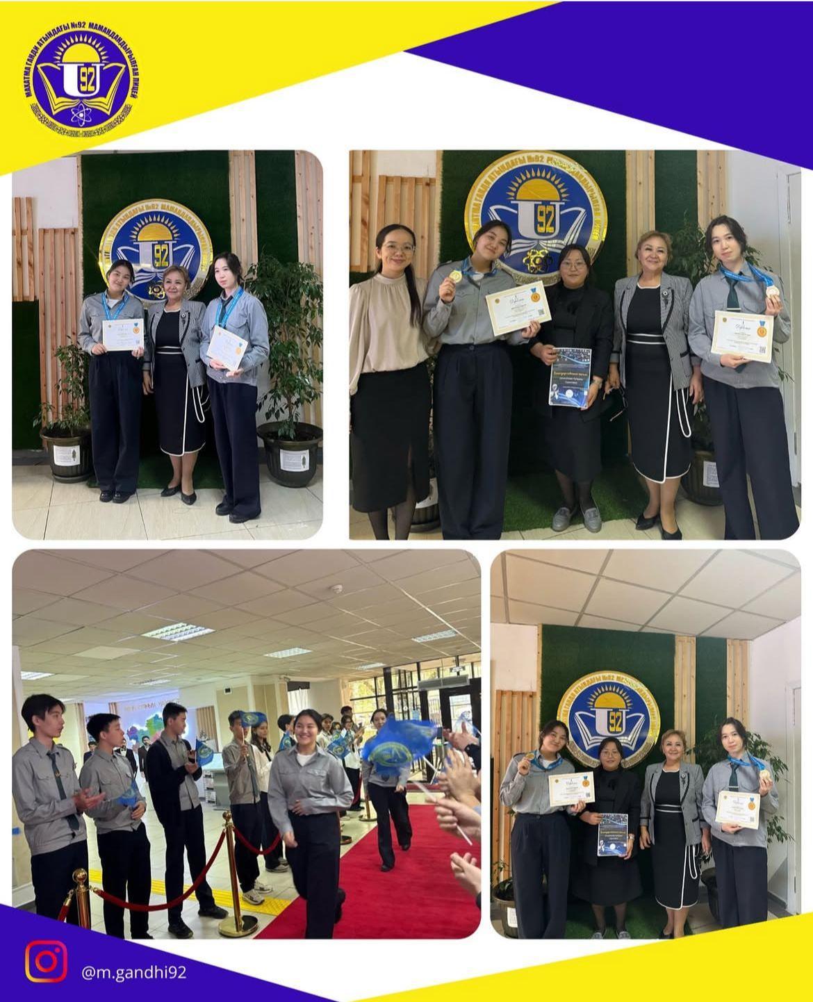 Алматы қаласы, Бостандық ауданы, Махатма Ганди атындағы №92 мамандандырылған лицей директоры Шажабаева Кульжан Сауытовна «Ғылым әлемін ашамыз» атты халықаралық ғылыми конкурстың 1-орын жеңімпаздары 10 «Ә» сынып оқушылары Жақсылыққызы Лейла мен Мухажан Арайлымды құттықтады.