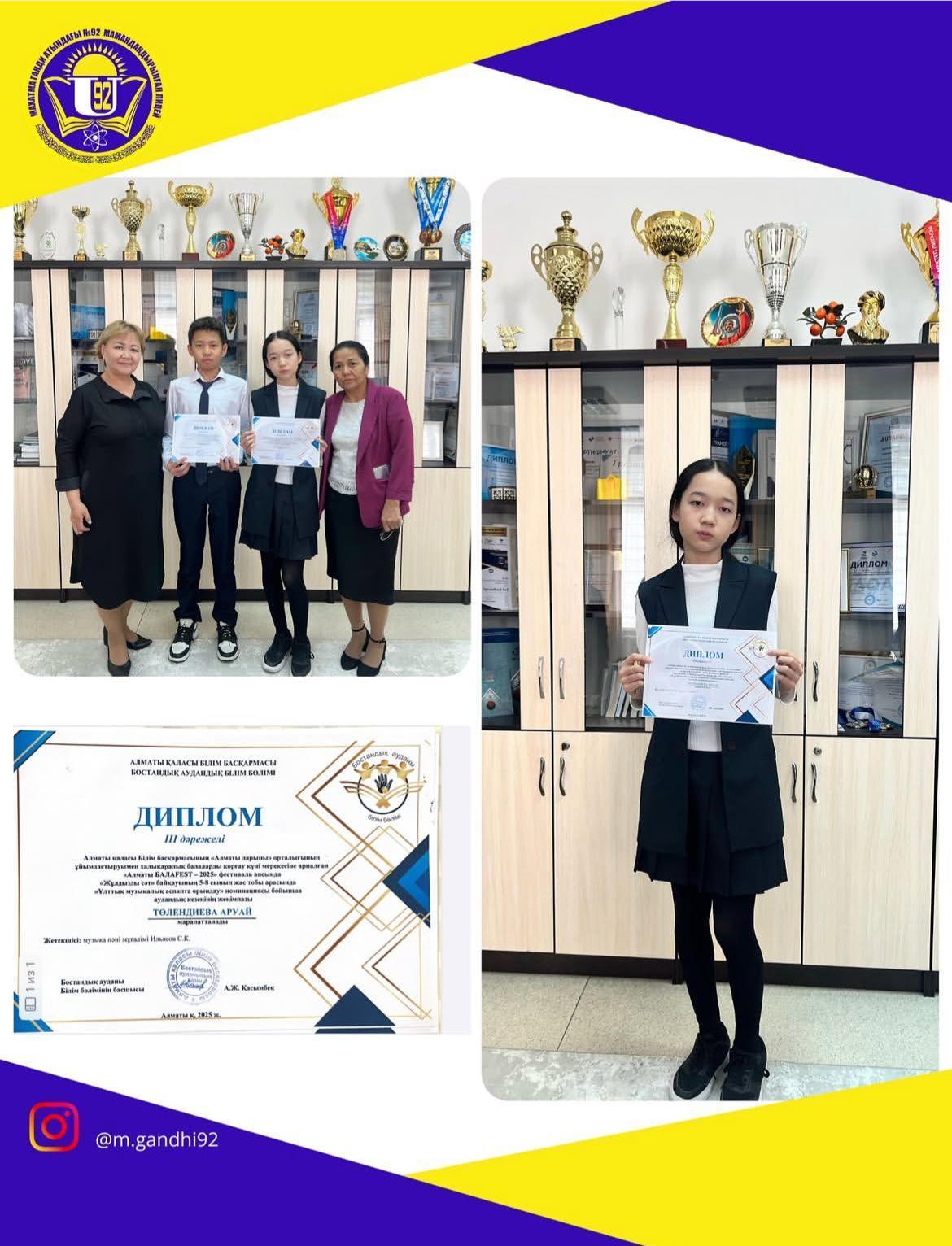 Алматы қаласы Білім басқармасының «Алматы дарыны» орталығының ұйымдастыруымен халықаралық балаларды қорғау күні мерекесіне арналған «Алматы БАЛАFEST – 2025» фестиваль аясында «Жұлдызды сәт» байқауының 5-8 сынып жас тобы арасында «Ұлттық музыкалық аспапта орындау» номинациясы бойынша аудандық кезеңінде Төлендиева Аруай 3-орынға ие болды.