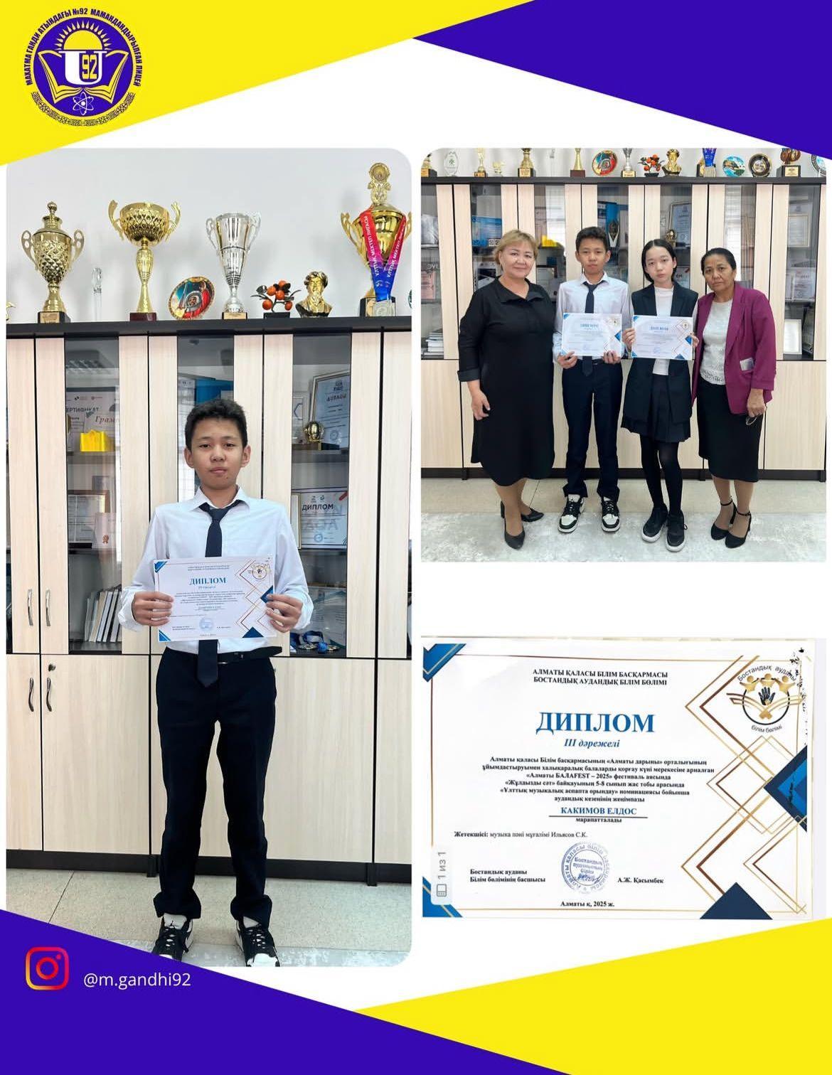 Алматы қаласы Білім басқармасының «Алматы дарыны» орталығының ұйымдастыруымен халықаралық балаларды қорғау күні мерекесіне арналған «Алматы БАЛАFEST – 2025» фестиваль аясында «Жұлдызды сәт» байқауының 5-8 сынып жас тобы арасында «Ұлттық музыкалық аспапта орындау» номинациясы бойынша аудандық кезеңінде Какимов Елдос 3-орынға ие болды.