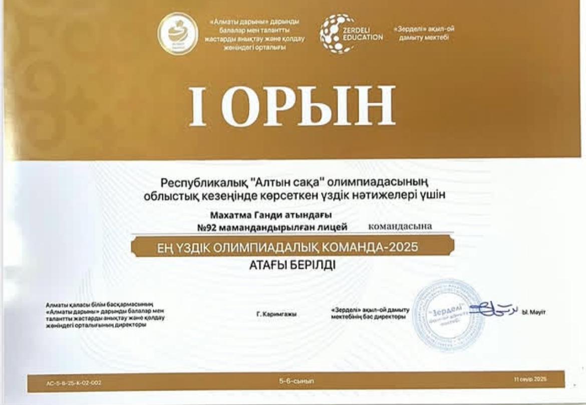 Республикалық «Алтын сақа» олимпиадасының облыстық кезеңінде көрсеткен үздік нәтижелері үшін лицейімізге 🏅«ЕҢ ҮЗДІК ОЛИМПИАДАЛЫҚ КОМАНДА - 2025» атағы берілді!