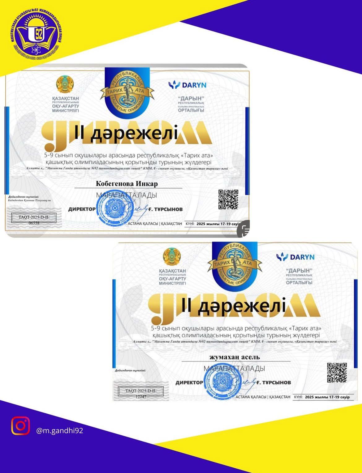 5-9 сынып оқушылары арасындағы Республикалық «Тарих ата» қашықтық олимпиадасының III орын иегерлері М.Ганди атындағы №92 мамандандырылған лицейі 8 сынып оқушылары: