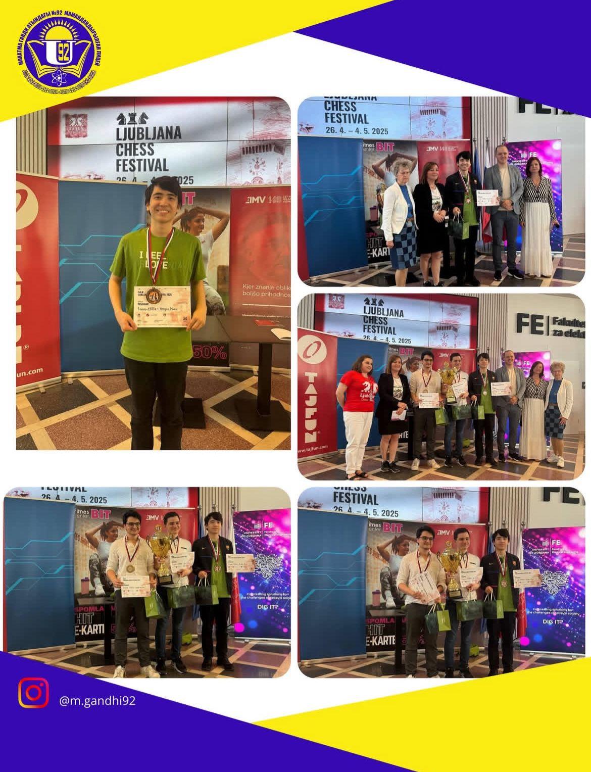 М.Ганди атындағы №92 мамандандырылғаг лицейдің 10 «Ә» сынып оқушысы Асылов Мирас «Ljubljana Chess festival 2025» турнирінде 9 турдан 7 ұпай жинап, 150 қатысушы қатысқан турнирде 3-орын иеленіп, Халықаралық шебердің 2-нормасын орындады.