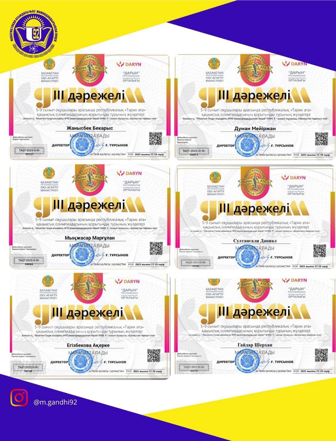 5-9 сынып оқушылары арасындағы Республикалық «Тарих ата» қашықтық олимпиадасының II орын иегерлері М.Ганди атындағы №92 мамандандырылған лицей оқушылары: