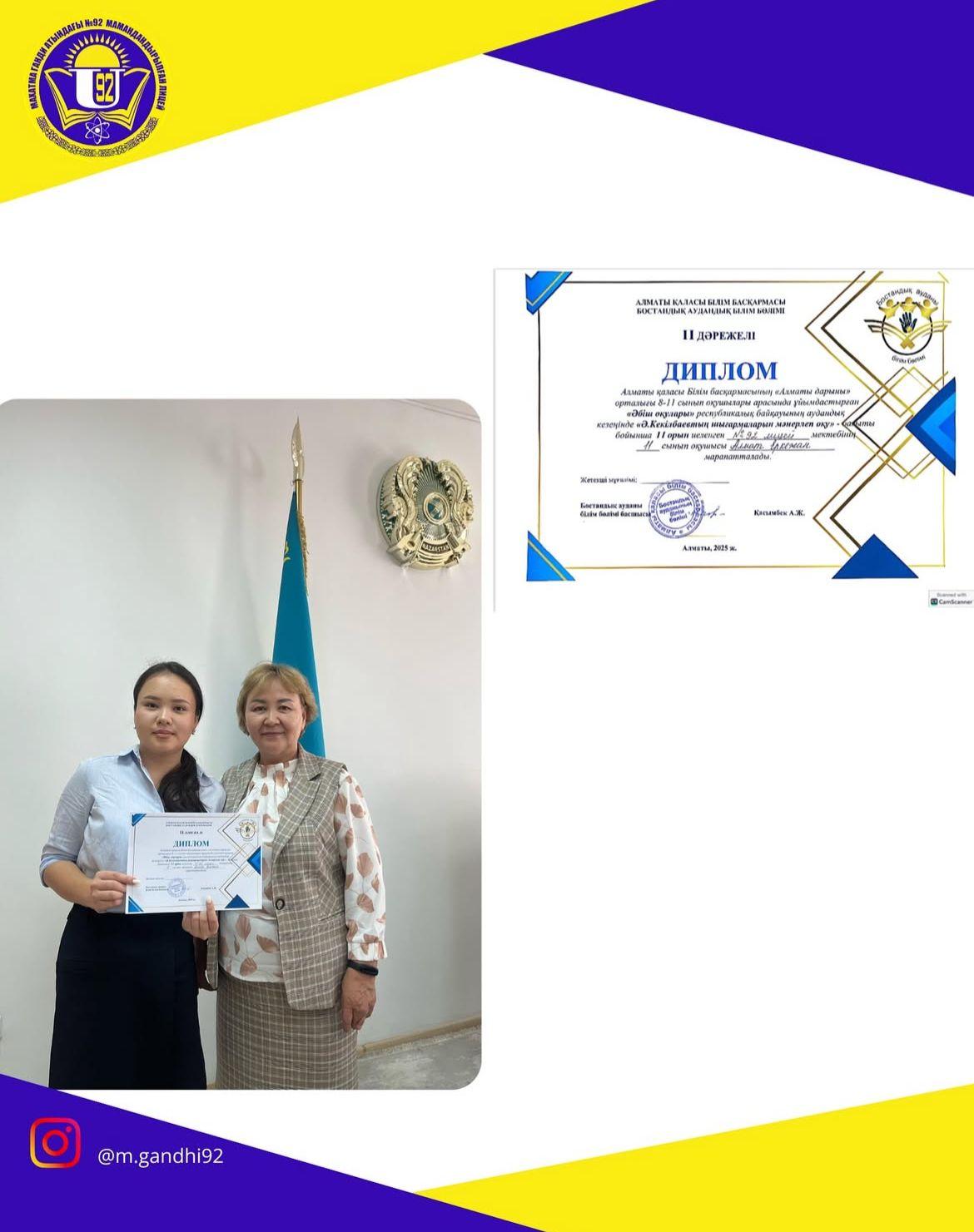 08 май 2025 0 1 2 3 4 5 «Әбіш оқулары» Республикалық байқауы Алматы қаласы Білім басқармасының «Алматы дарыны» орталығының ұйымдастыруымен 8-11 сынып оқушылары арасында өткізілген «Әбіш оқулары» Республикалық байқауының аудандық кезеңінің II орын жеңімпазы Алмат Еркежан.Құттықтаймыз💐