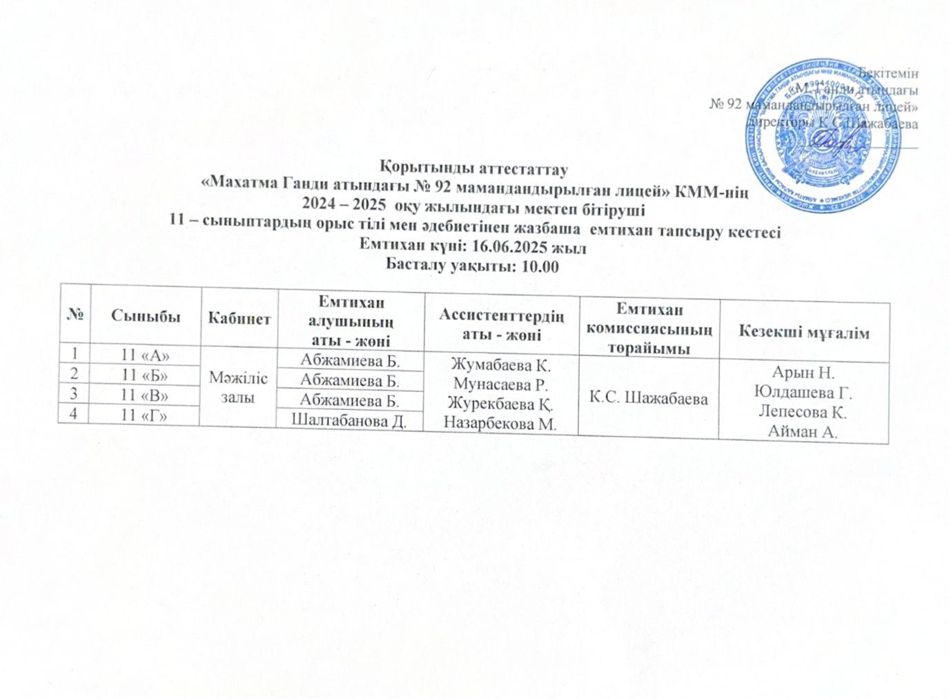 » 11-сыныптардың мемлекеттік емтихан тапсыру кестесі
