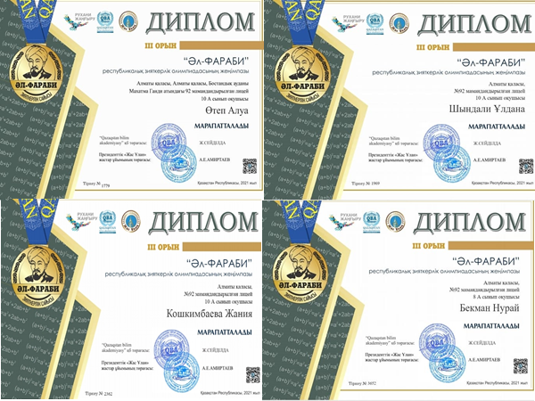 10 "А" сынып оқушылары Өтеп Алуа, Шындали Ұлдана, Кошкимбаева Жания "Әл-Фараби" республикалық зияткерлік олимпиадасынан жүлделі ІІІ орынға ие болды.
