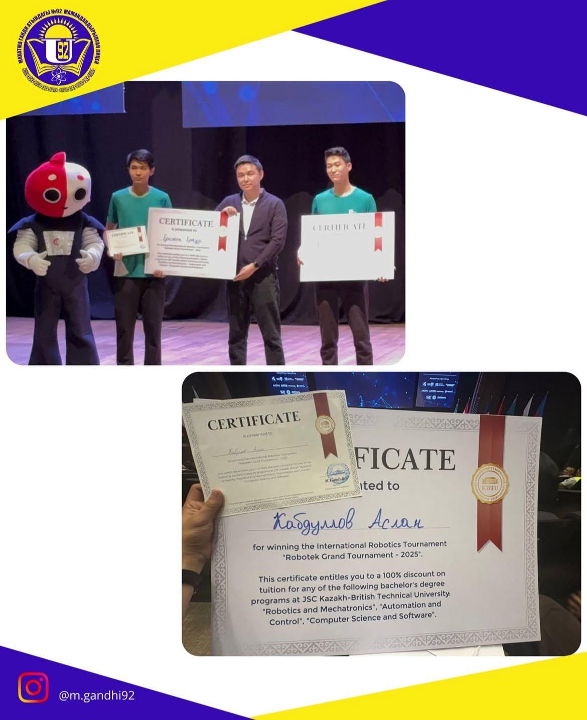 13.05.2025 ж. күні Робототехникадан өткен «Robotek Grand Tournament» халықаралык чемпионатына Махатма Ганди атындағы №92 мамандандырылған лицей оқушыларынан құралған «URAN 92» командасы