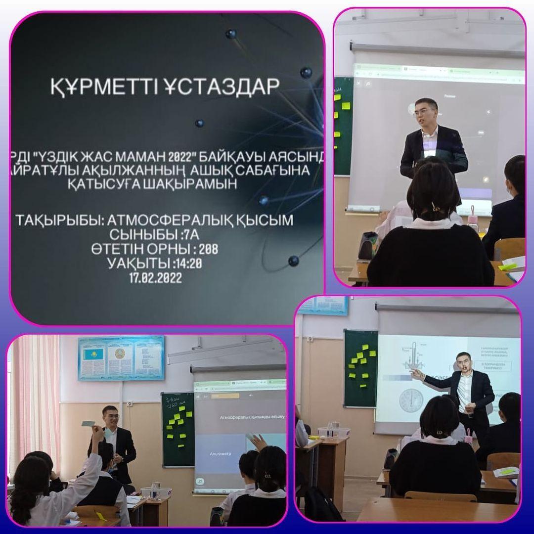 17 февраль 2022 0 1 2 3 4 5 Ашық сабақ: "Атмосфералық қысым" 🔸Мектепішілік «Үздік жас маман - 2022» байқауының екінші кезеңінің қатысушысы физика пәнінің мұғалімі Қайратұлы Ақылжанның ашық сабақ өту барысы🎊Ашық сабақ тақырыбы: Атмосфералық қысым