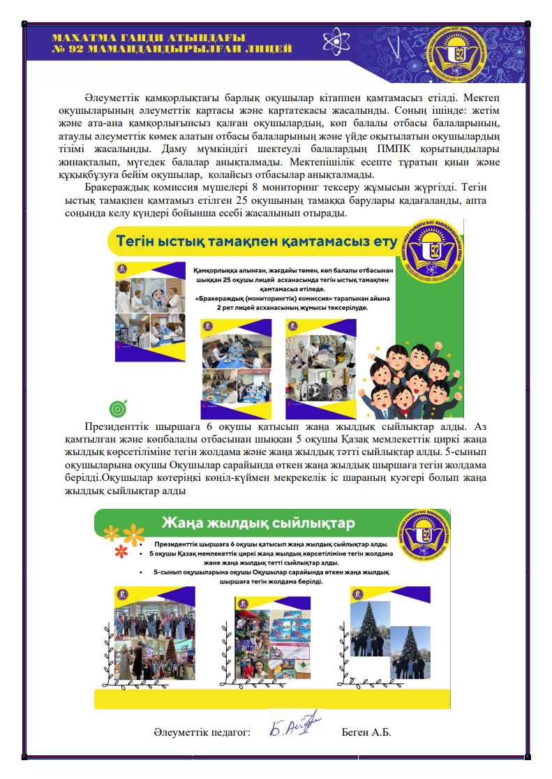 М.Ганди атындағы №92 мамандандырылған лицей 2021-2022 оқу жылындағы атқарылған жұмыстардың ЖЫЛДЫҚ ЕСЕБІ