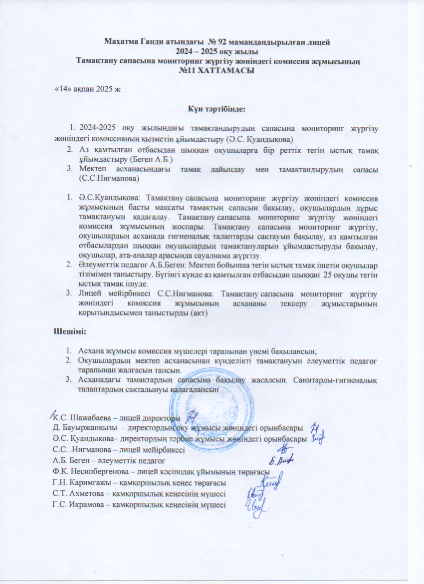 14 февраль 2025 0 1 2 3 4 5 Тамақтану сапасына мониторинг жүргізу жөніндегі комиссия жұмысының №11 ХАТТАМАСЫ