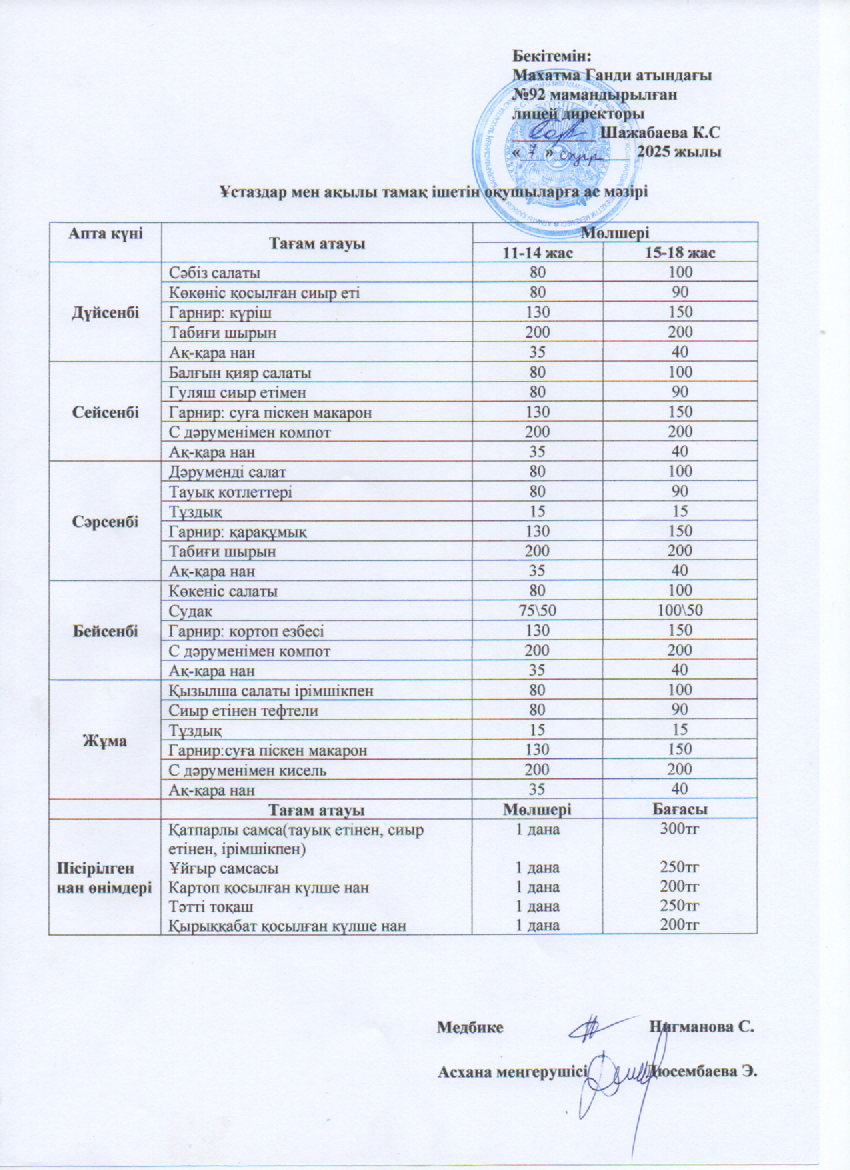 Ұстаздар мен ақылы тамақ ішетін оқушыларға ас мәзірі
