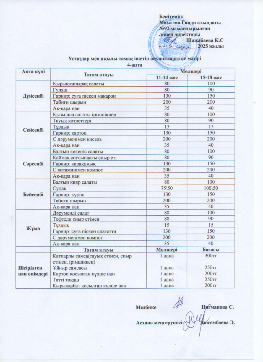 Ұстаздар мен ақылы тамақ ішетін оқушыларға ас мәзірі
