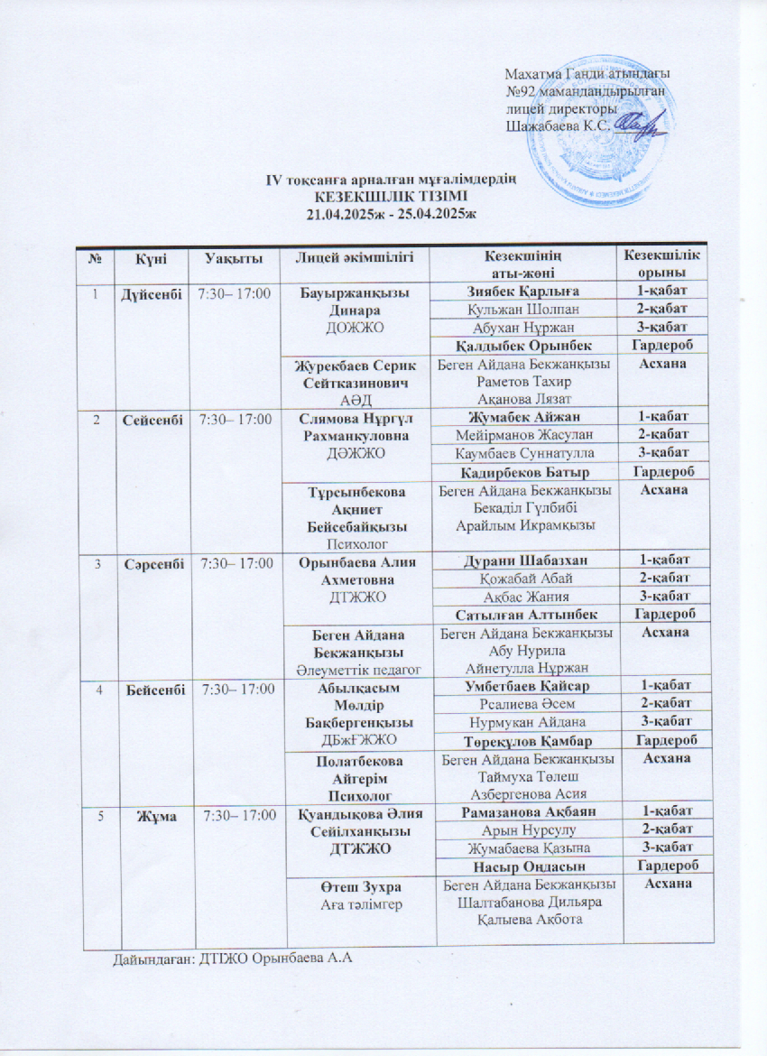 Мұғалімдердің кезекшілік кестесі