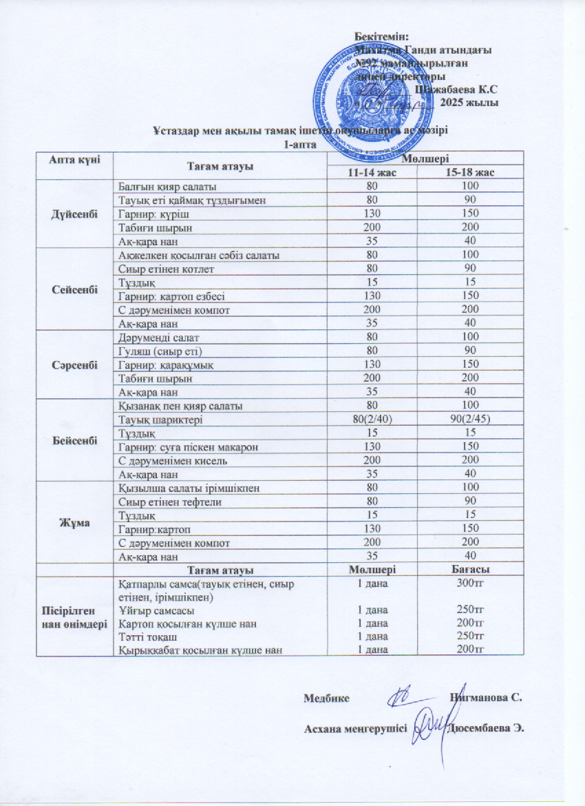 Ұстаздар мен ақылы тамақ ішетін оқушыларға ас мәзірі