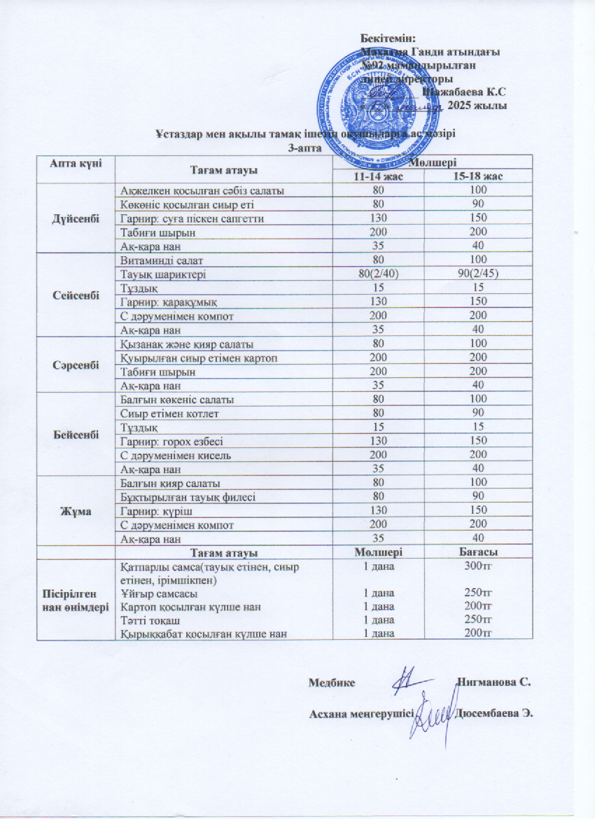 Ұстаздар мен ақылы тамақ ішетін оқушыларға ас мәзірі
