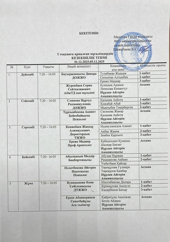 Мұғалімдер кезекшілік кестесі 2 тоқсан