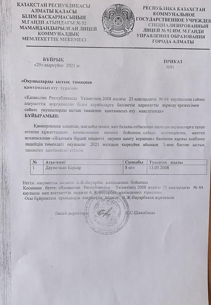 КГУ «Специализированный лицей №92 имени Махатма Ганди» Управления образования города Алматы